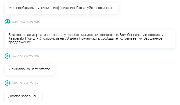 Привет! Я 30 минут ждал подключение оператора. Он что-то предложил и завершил диалог. Теперь поддержка спит. Прошу вернуть деньги за нерабочий сервис, шифрование выполняется недостаточно по моему мнению. Подписка на антивирус мне не нужна. В оферте не было указано что мне заменят сервис Secure connection подпиской на антивирус в случае если сервис работать перестанет. Прошу вернуть деньги оплаченные наперед компании Касперского, включая деньги оплаченные до момента изменения условий использования Secure Connection в России!!! При всем уважении к команде! Их расследованиям и обеспечения безопасности инфрасктуры, это продукт выглядит как мошеннический! Если прогнулись - верните деньги за нерабочий сервис! -
