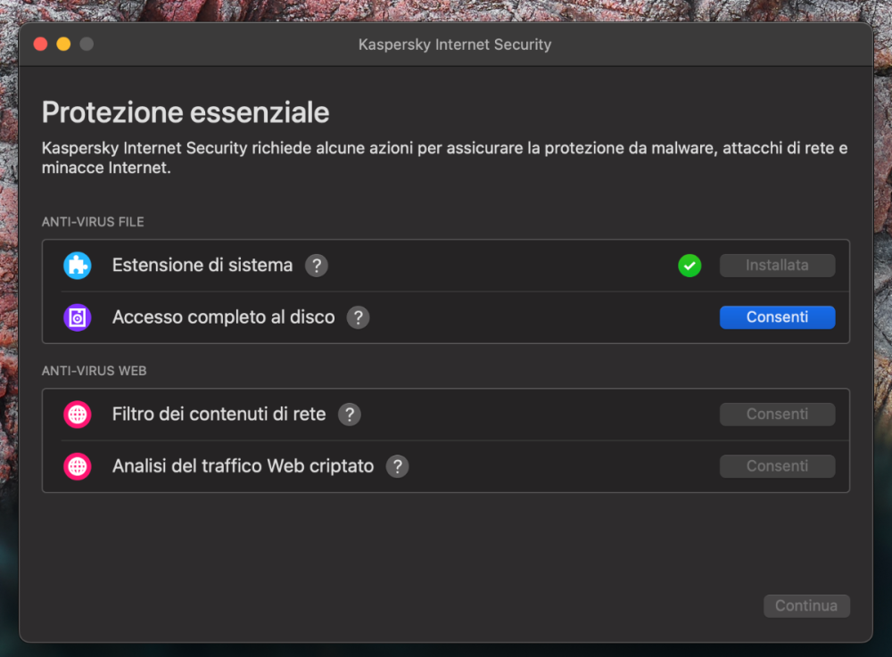 salve, sul mio mac, Kaspersky Internet Security non funziona più, pur essendo spuntate le voci sul controllo completo del disco... mi dice di aggiungere le eccezioni, ma sono gia presenti ed abilitate come rimediare... grazie