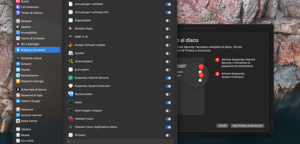 Buongiorno, Ho installato Kaspersky premium su un MacBook Pro m1 con macOS 13. Una volta installato l’applicazione, il computer è diventato lentissimo ad avviarsi dopo aver inserito la password dell’urente. Passano anche diversi minuti prima che il computer torni a funzionare. Rimuovendo Kaspersky il Mac torna a funzionare, avviandosi immediatamente. Ho anche provato a ripristinare il computer alle impostazioni di fabbrica ma questo non ha risolto il problema. Come posso fare per risolvere questo problema? Grazie