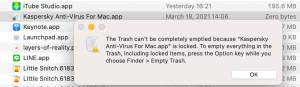 My 2019 Macbook Pro burnt out the other day and I had to get another drive. Fortunately, I had a time machine backup to restore from. However, that hasn't gone as I had hoped. Finally got my Apple ID but Microsoft Outlook crashes on loading. I googled and found that Kaspersky and a VPN I had installed could be the problem. I exited the latter and tried to uninstall Kaspersky Internet Security to no avail. I have a zerob file (locked) in the Application folder. Can anybody suggest how I can unlock this thing in order to trash it and if there is anything else that I am missing in not being able to access Microsoft Outlook? Thanking you in advance Sabina Tokyo, Japan -