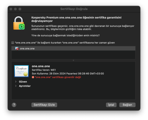Merhaba, Kaspersky büyük ihtimal kullandığım DNS ile ilgili sertifikayı doğrulayamıyor. Asıl sıkıntı ise uyarı mesajını sürekli göstermesi. Her ne kadar sertifikaya güven seçeneğini seçsemde bir süre sonra tekrar aynı uyarı karşıma çıkıyor. Ne yaptıysam sorunu gideremedim, kullandığım DNS ise Cloudflare'ın DNS'i yani güvendiğim bir DNS. Ne yapmam lazım? macOS: Sonama 14.5 Kaspersky Sürümü: 25.0.0.332a