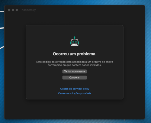 Comprei o Kaspersky premium recentemente e ao intalar ele deu o erro da imagem abaixo, ja desisntalei e instalei varias vezes, reiniciei a maquina (Mac M3 Pro), coloquei o serial manualmente e nada resolve, se eu coloco email e senha, gera a mesma msg. já abri suporte mas nao obtive retorno ate o momento. Tambem nao localizei o local para solicitar o reembolso.
