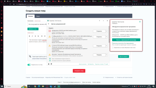 Версия ОС 21H2 (19044.2130) Версия Касперский 21.19.7.527(b) Через полную проверку нашел пару вредоносных файлов, решил устранить и понял что файлы не удаляются вовсе устранение файлов просто находится в бесконечной загрузке Хотелось бы узнать что с этим можно сделать и как все таки устранить вирусняки помогите плз- 1 reply
