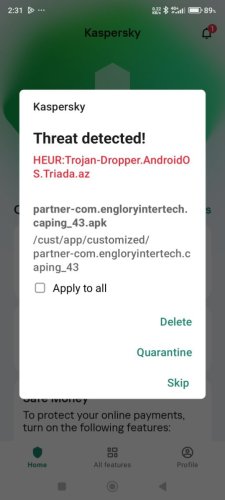 Kaspersky unable to quarantine nor delete HEUR:Trojan-Dropper.AndroidOS.Triada.az on my smartphone. It takes forever to delete, always scanning but not finishing. So I close the app. And when I open it again to scan, it's still there. What should I do? Should I just "Skip"? Is it harmless? Thanks in advance. -