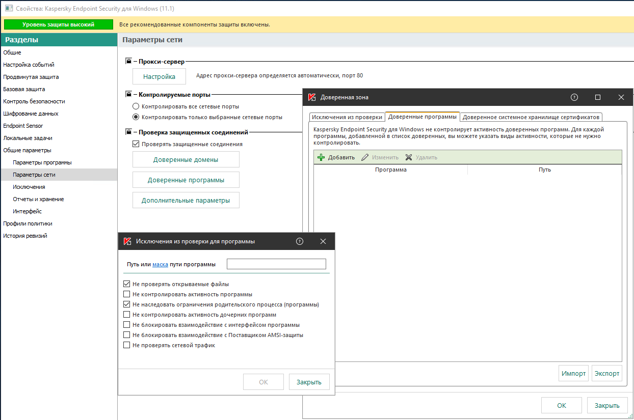 Контроль программ и доверенные программы не одно и тоже. ПО, которое было добавлено в “Доверенные программы” исключается не из проверки KES (в зависимости от выбранные функций в исключении)