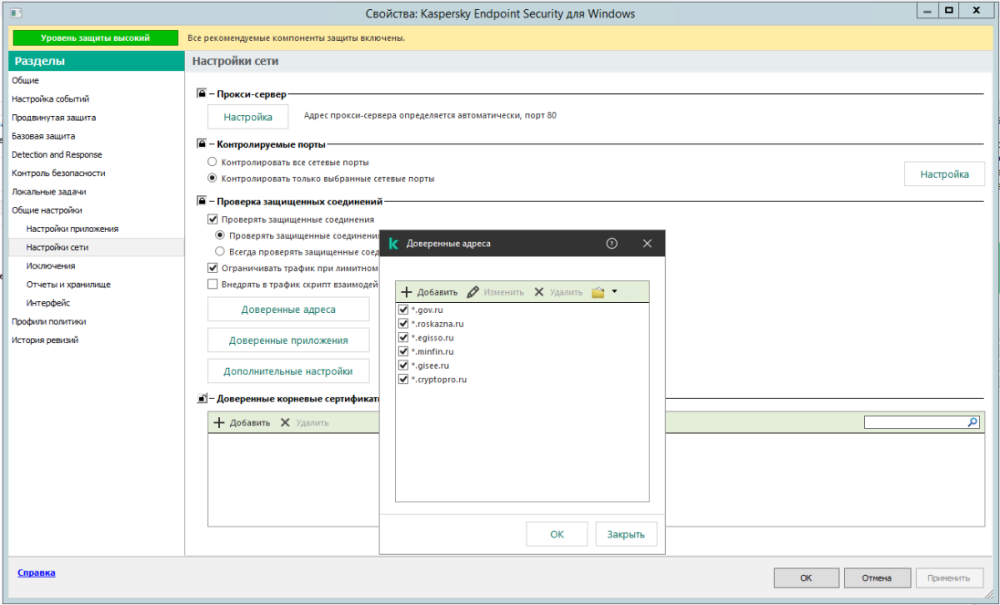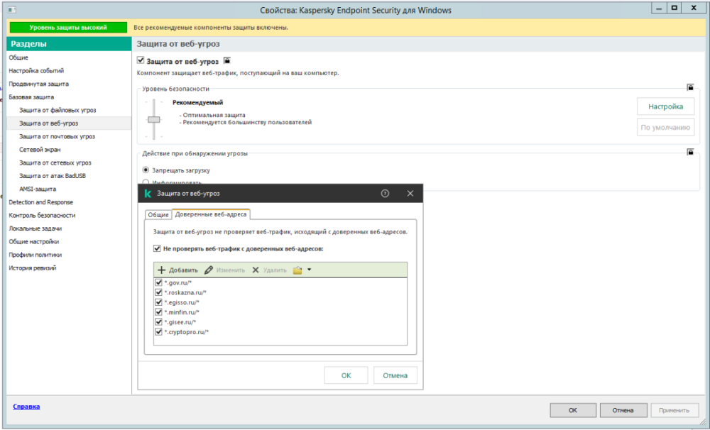 Защита от веб-угроз блокирует интернет KES 11.1.0.15919
