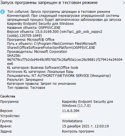 В списке событий сервера администрирования сделал выборку по типу события “Запуск программы запрещен в тестовом режиме”, но помимо нужных мне программ удаленного доступа (первый скриншот) начали появляться всевозможные другие программы по известным и нет KL-Категориям, которые я не задавал (второй скриншот).