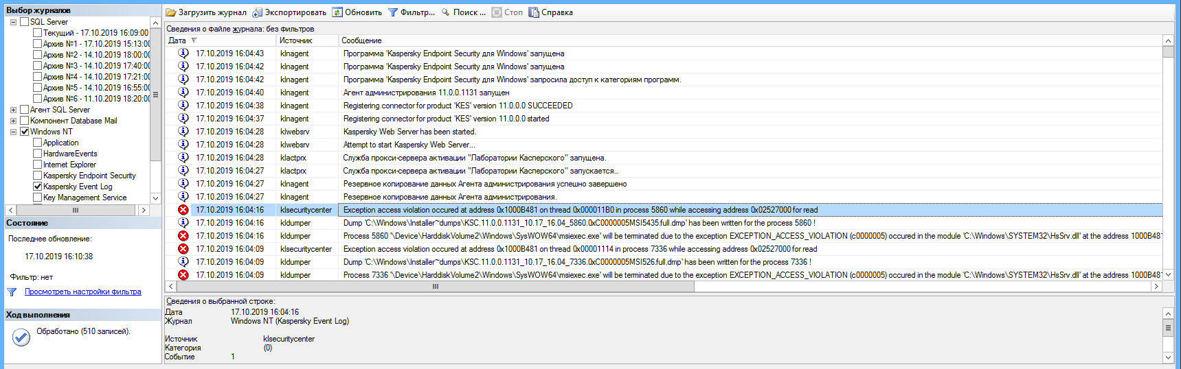 Пожалуйста, приложите также к своему ответу эвентлоги Касперского, системы и приложений.