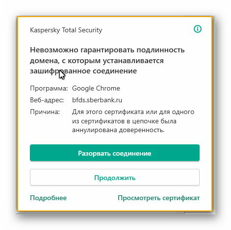 И все-таки, для среднестатистического чайника, боящегося потерять на СберОнлайне  свою пенсию при оплате услуг по доставке (сами маломобильные инвалиды) еды и лекарств, чем руководствоваться, получая подобное предупреждение Касперского?