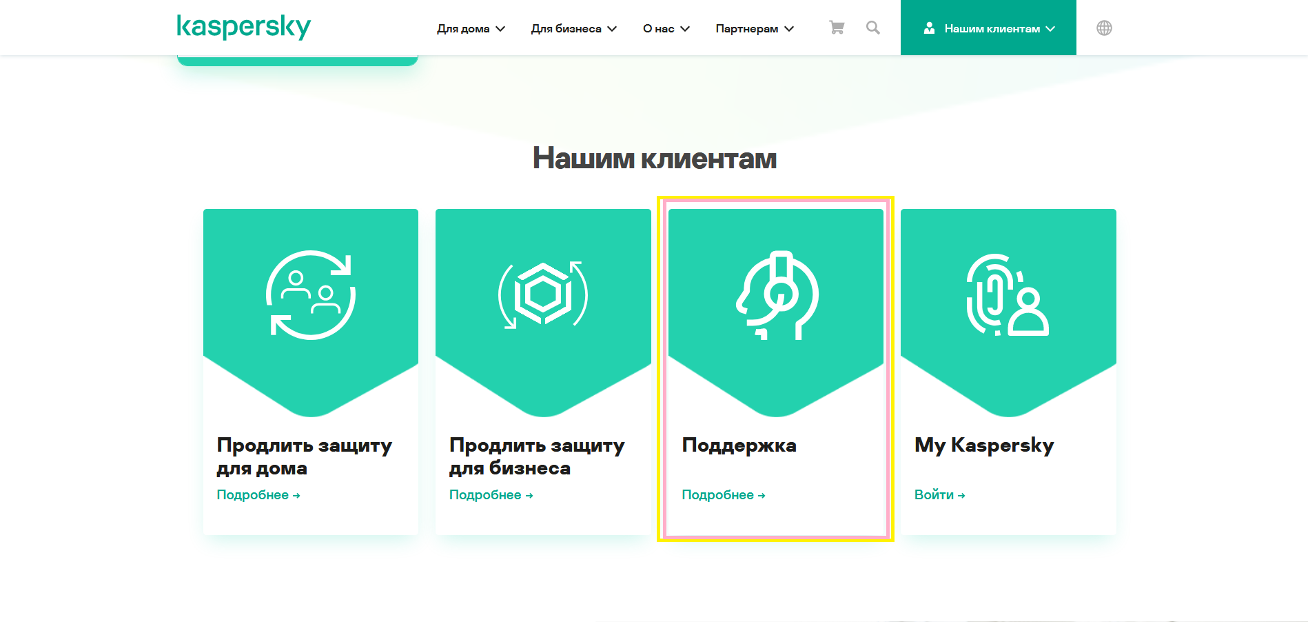 Вот именно этот пункт меню ведет на https://support.kaspersky.com/