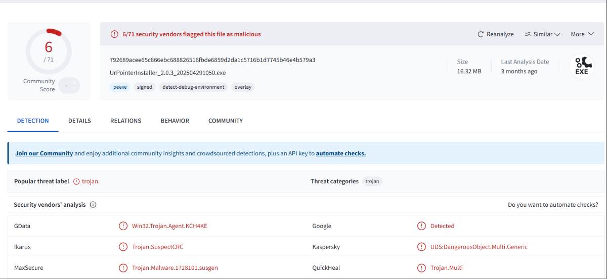 问题描述:从绿联官方网站下载的翻页笔配套软件,手动扫描未报告,安装完成后对释放的UrPointer.exe报PDM:Trojan.Win32.Bazon.a,对释放的UrPointerInstaller_2.0.3_202504291050.exe报告PDM:Trojan.Win32.Bazon.a。