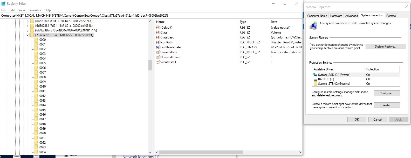 No UpperFilters yet System Protection appears?  If so, my advice is wrong
