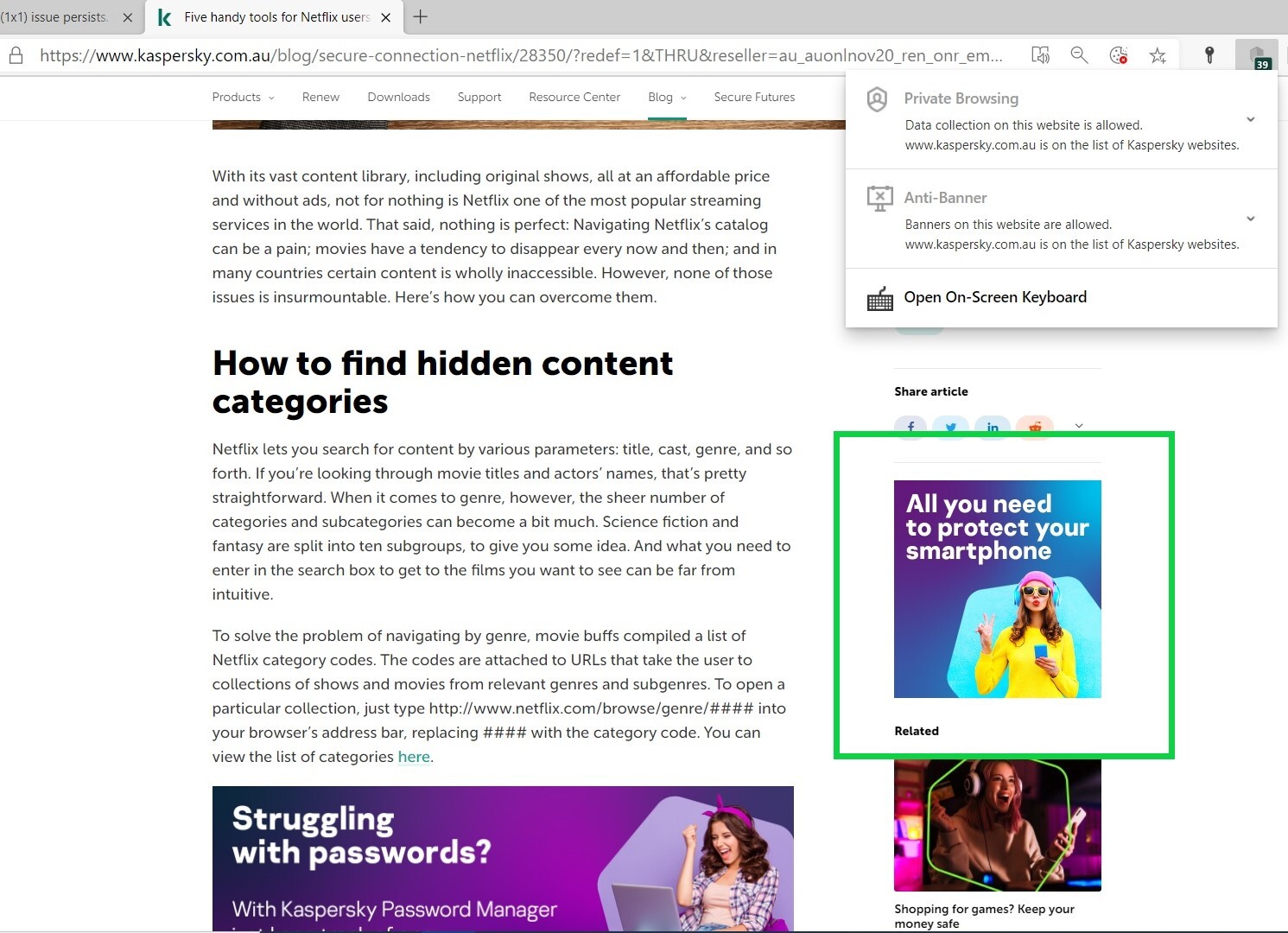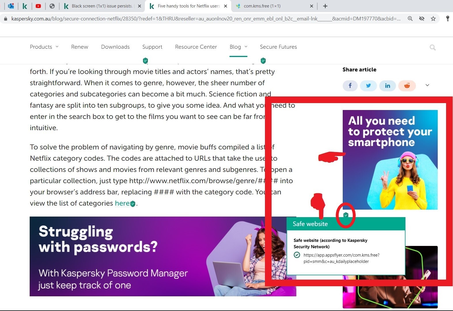 Black screen 1 x 1 issue persists, v21.2.16.590, Kaspersky blog: All you need to protect your smartphone side link on article: Five life hacks for Netflix users, all Supported browsers: