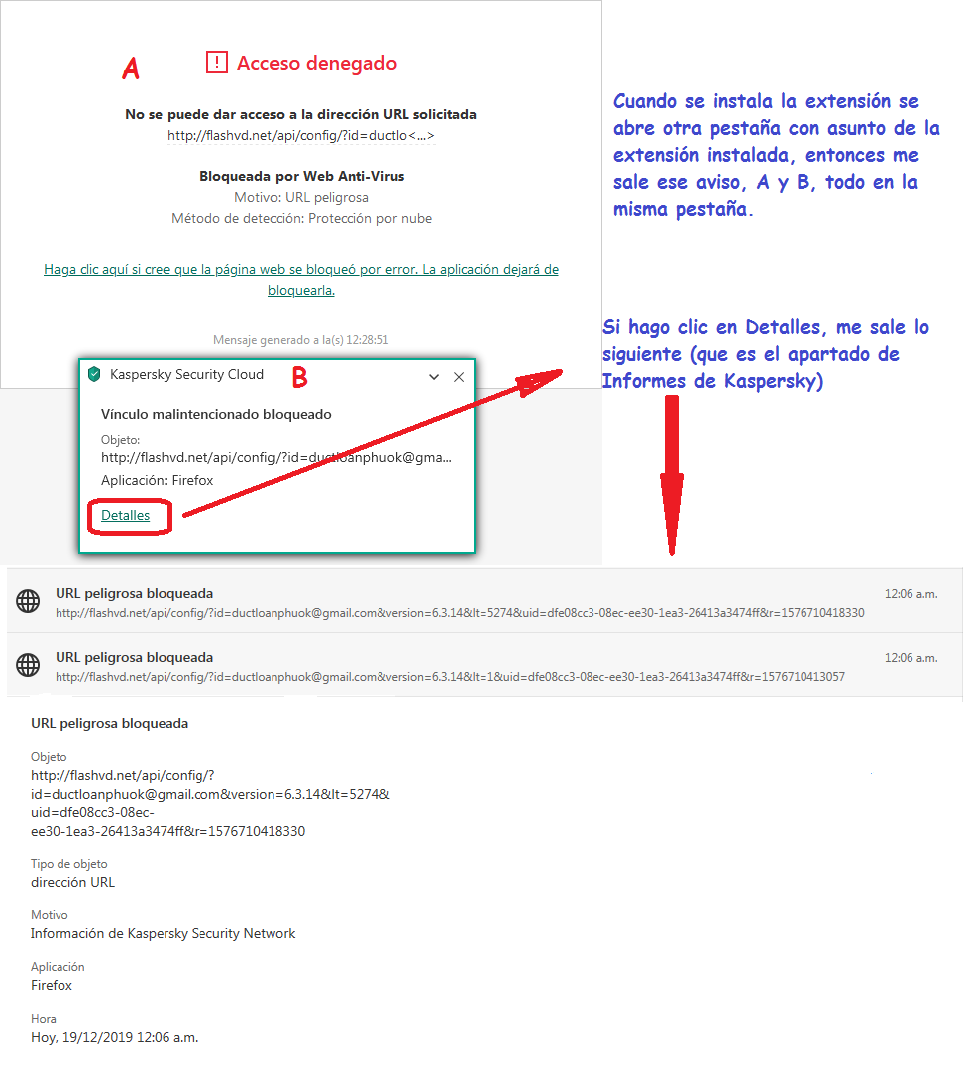 El problema es que cuando la instalo, se abre una nueva pestaña, la típica de haber instalado la extensión (ocurre con la mayoría de las que se instalan) dando la bienvenida u otra información, etc... pero me salta un aviso de Kaspersky diciendo algo así como "URL maliciosa bloqueada" (abajo se lo explico con imágenes).