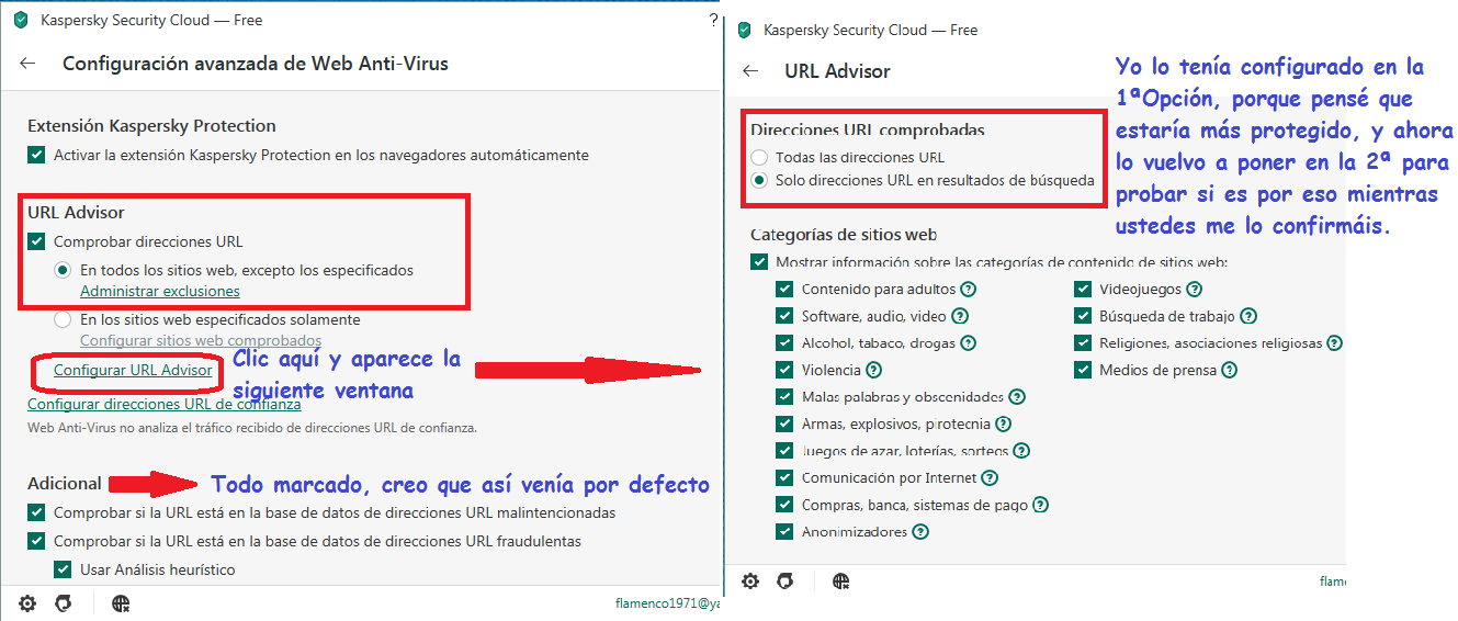 De momento el URL Advisor sigo como lo puse para probar, que es como usted en su respuesta me dice que lo tiene. La única diferencia es que usted lo tiene en grado medio y yo en alto.
