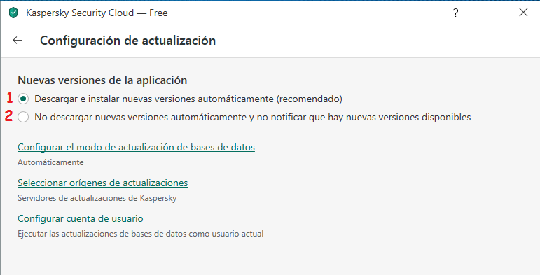 Usted me puede decir... "marque la 2ªOpción"... bien... si elijo la 2ªOpción me ocurre que además de no actualizarse la aplicación (el antivirus solamente) resulta que la base de datos de virus tampoco lo hace, aunque esta esté configurada de manera automática.