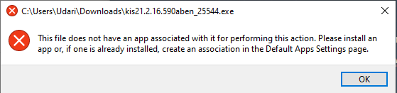 Error: This file does not have an app with it for performing this action. Can't install KIS21.2.16... .exe.