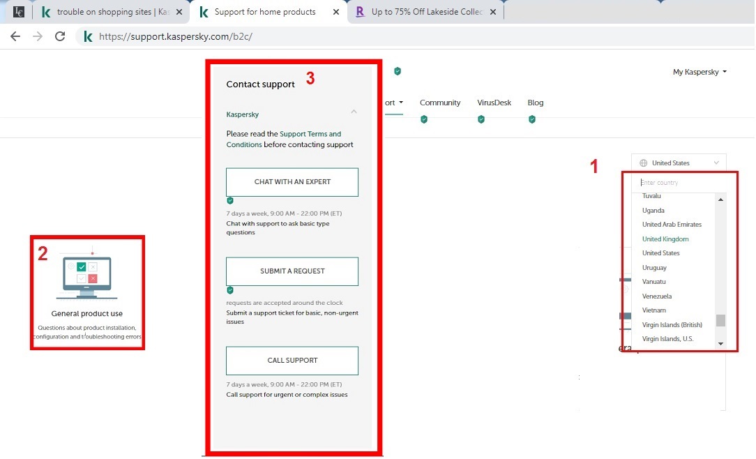 Go to the Support page, select your (1Country from the dropdown list, (atm my image shows US, as I don’t know your location), on Support page (for your location), select (2GENERAL PRODUCT USE icon, from the options available (3) , select, CHAT WITH AN EXPERT, not available all locationsCALL SUPPORT, not available all locations or SUBMIT A REQUEST, this is done via your MyKaspersky account, as per my previous reply with the incident template image.