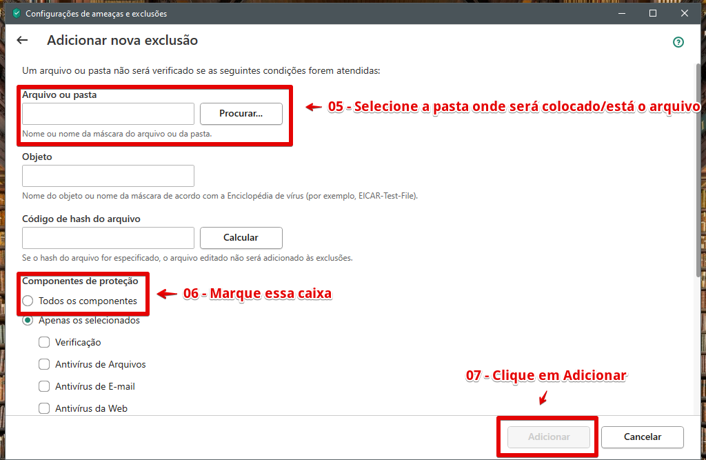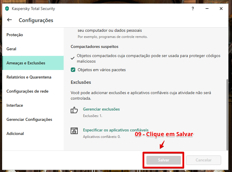 Você também poderá adicionar o arquivo (ou sua pasta) na lista de exclusões dessa forma o arquivo não será detectado e deletado pelo Kaspersky, para isso siga os passos abaixo: