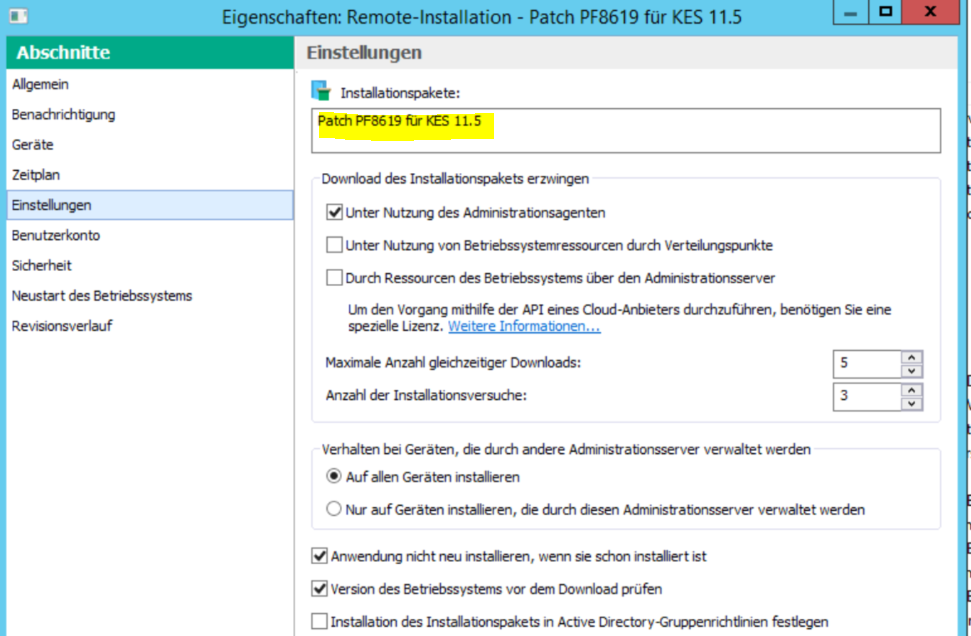 Es sei denn, es wurde in der Richtlinie ein Programmschutzkennwort hinterlegt. Den entweder für die Patch-Installation temporär ausschalten oder das Kennwort bei den Startparametern mitgeben (Vorsicht: steht dann im Klartext im Paket):