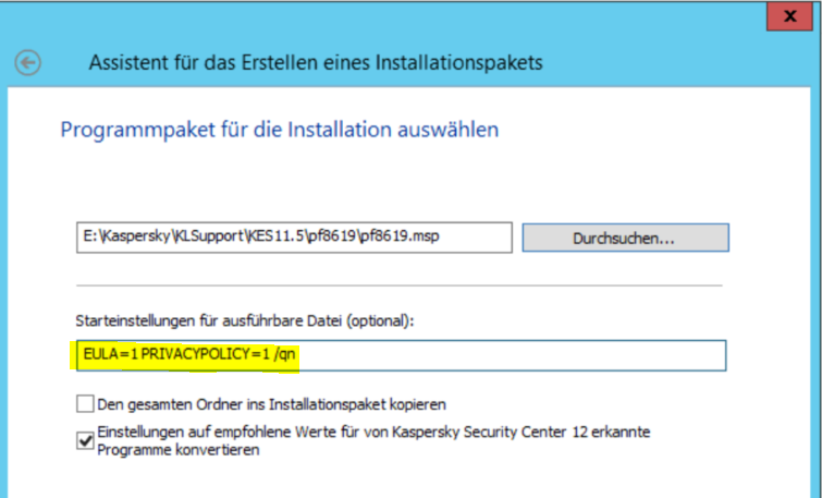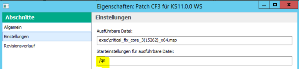 Du wählst die Patch-Installationsdatei (msp) und ergänzt bei der PF8619 für KES11.5 bei den Starteinstellungen: