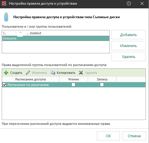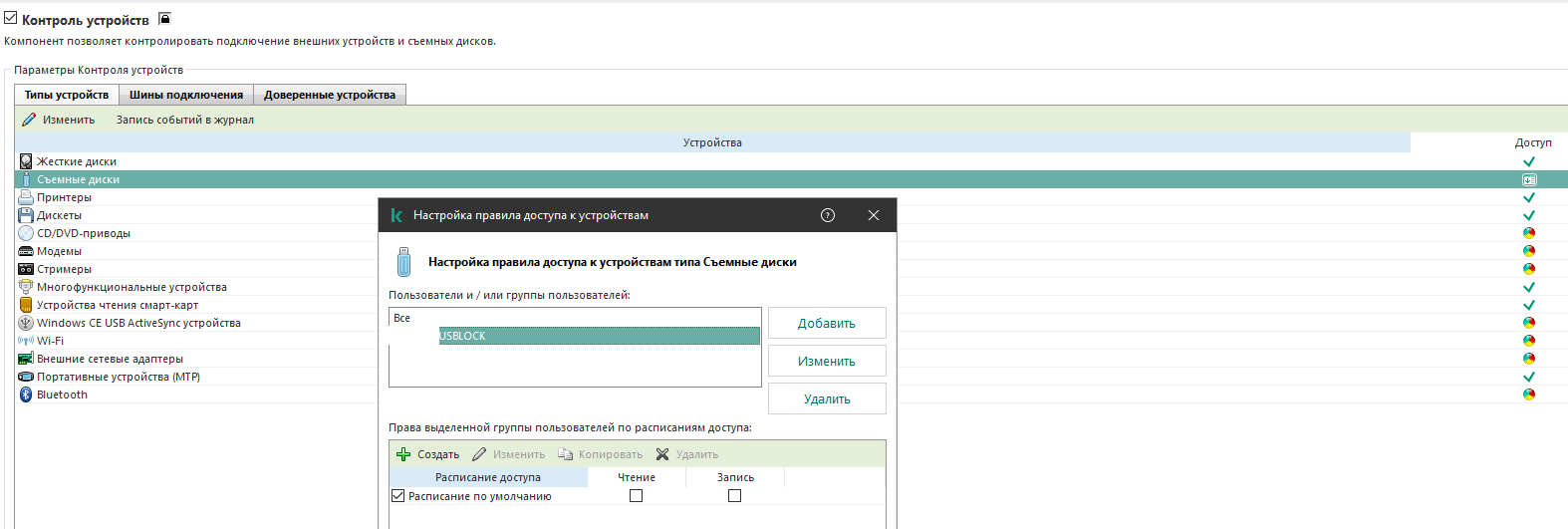 Проблема: При настройке политики в разделе Контроль безопасности/Контроль устройств/Типы устройств исправно работает только группа AD "Пользователи домена". Корректно отрабатывается и запрет доступа - и разрешение. При указании любой другой группы - запрет доступа вне зависимости от указанных параметров доступа в расписании. Подробности настройки - в скриншоте.