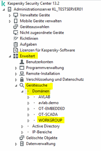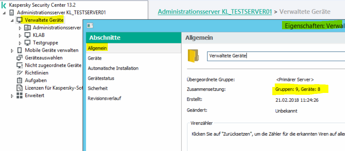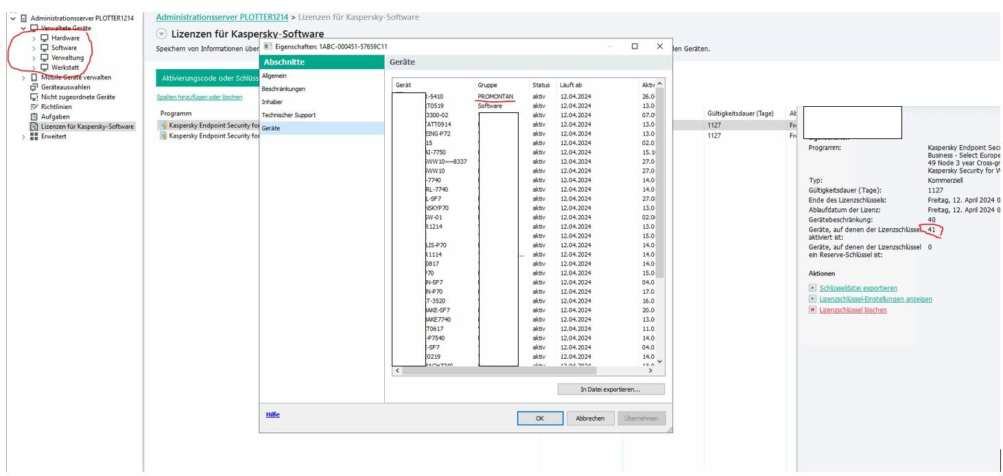 In einem anderen Menüpunkt tauchen Computer in den [Lizenzschlüsseleinstellungen] unter [Geräte] taucht eine Gruppe auf die im KSC nicht sichtbar ist…