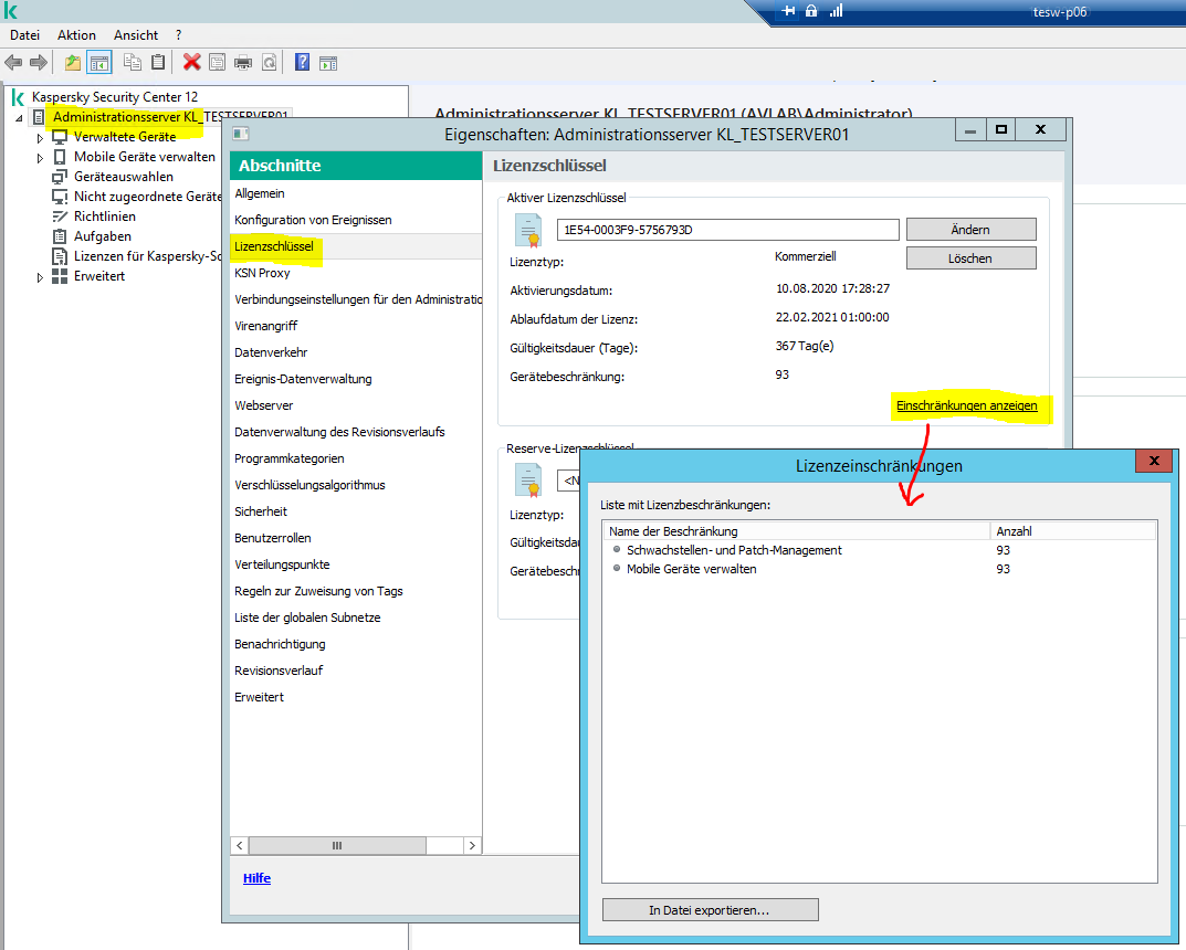 es gibt 2 verschiene Lizenzen eine ist für die Console KSC die andere wird bei jedem Client eingetragen. Wo wird die Lizenz für die Console eingetragen. Unter Eigenschaften, Lizenzschlüssel des Administrationsserver gibt es Lizenzen. Dort ist aber der Lizenschlüssel der Clients eingetragen.