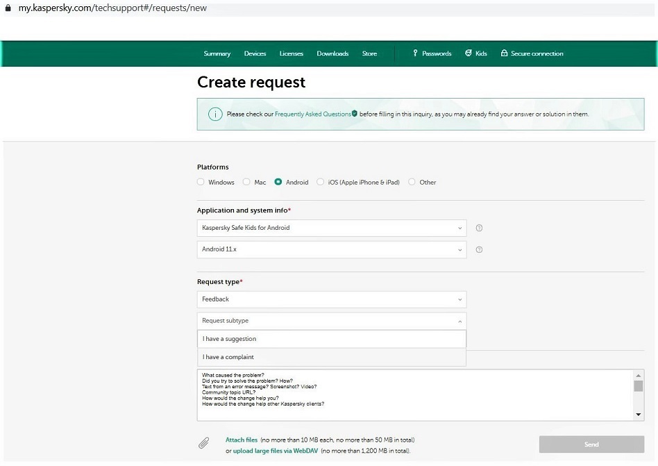 If you’d like a KSK enhancement/new feature, raise a request to Kaspersky Technical Support, select Feedback, I have a suggestion or Feedback, I have a complaint
