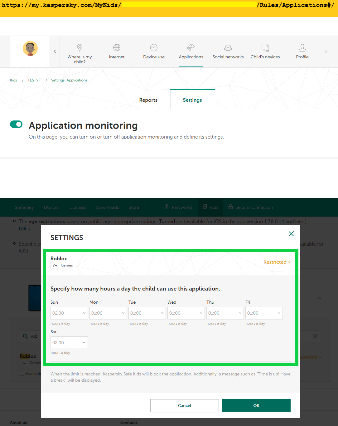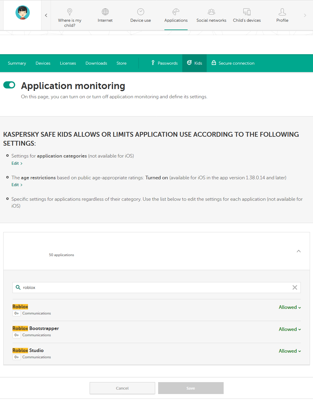 • In MyKaspersky, Kids tab, Application monitoring, can you not see Roblox
