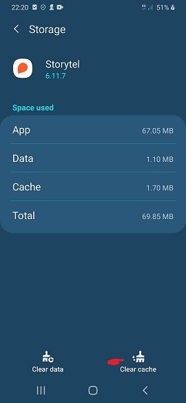1. Clear Storytel cache, open Phone Settings⚙ , go to Apps, go to Storytel, select, Storage, select Clear cache → see image 1 below