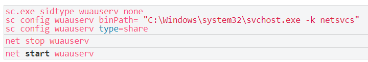 sc config wuauserv binPath= "C:\Windows\system32\svchost.exe -k netsvcs"