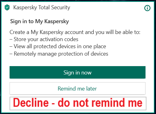 Sin in to my Kaspersky - missing Decline - do not remind me option