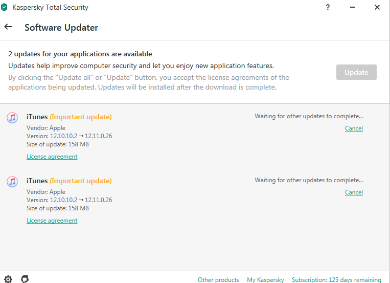 What about my account, the other devices on My Kapersky Total Security? Damn, tell me how to turn off the update for iTunes. I barely use the program anyway?