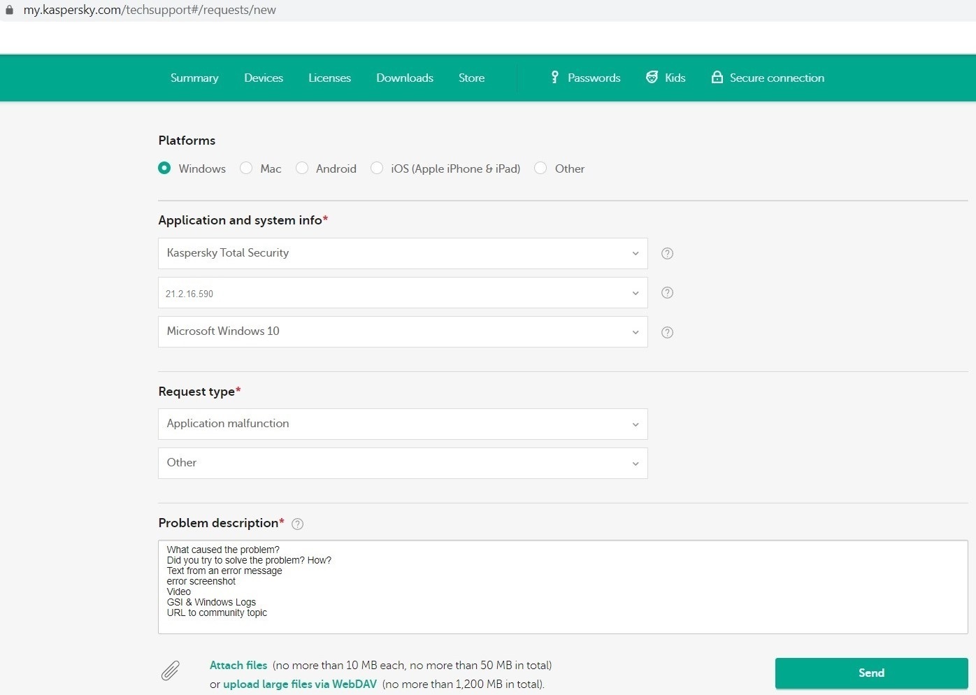 • Contact Kaspersky Technical Support, fill in the Application malfunction, Other template, in the KTS version field, fill in  21.1.15.500, not  21.2.16.590; include: