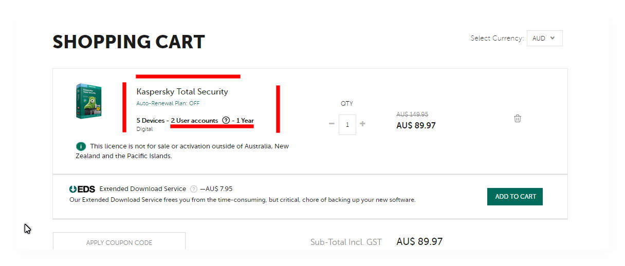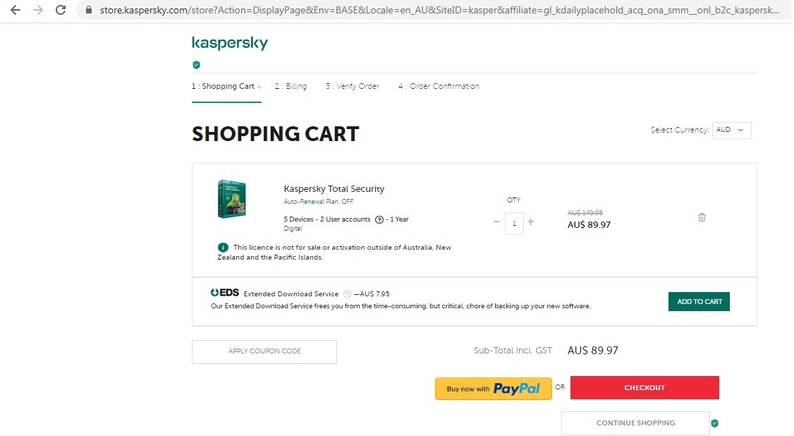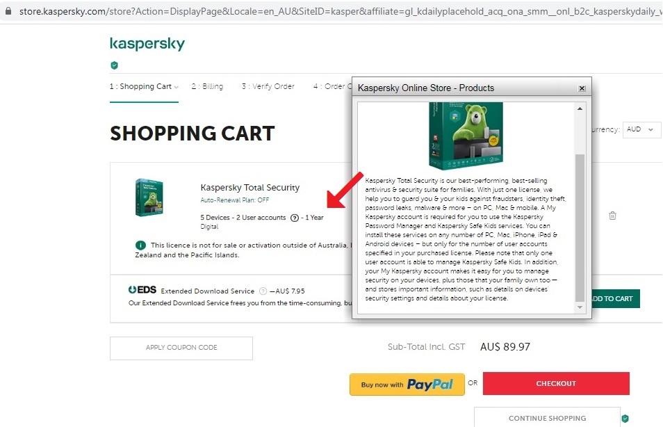 Total Security due 13 days keeps asking for $A149.95 instead of $A89.95