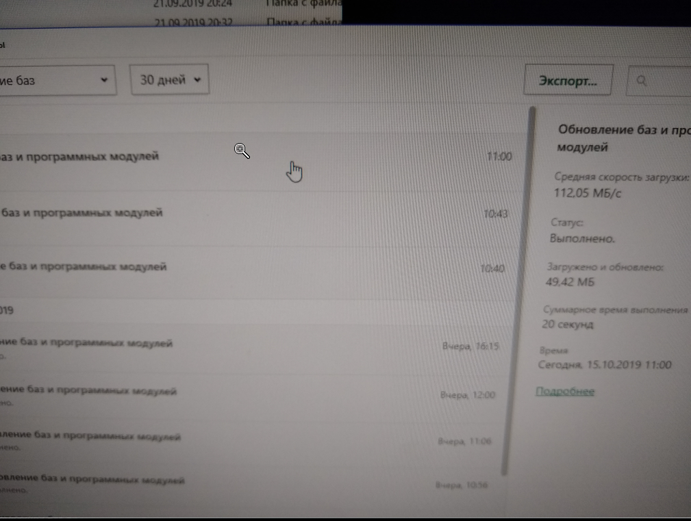 15.10.2019 11.00.45	Обновление баз и программных модулей	Выполнено.	Средняя скорость загрузки:: 112,05 МБ/с	Статус:: Выполнено.	Загружено и обновлено:: 49,42 МБ	Суммарное время выполнения: 20 секунд	Время: 15.10.2019 11:00