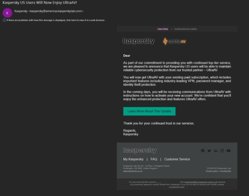 FWIW, ultrasecureav.com has been around for all of 2 months (https://web.archive.org/web/20240000000000*/ultrasecureav.com). Without too much digging, my bet is KAV has incorporated out of RU and is "reselling" as UAV. I guess we'll all find out once we install the "new" product! ?