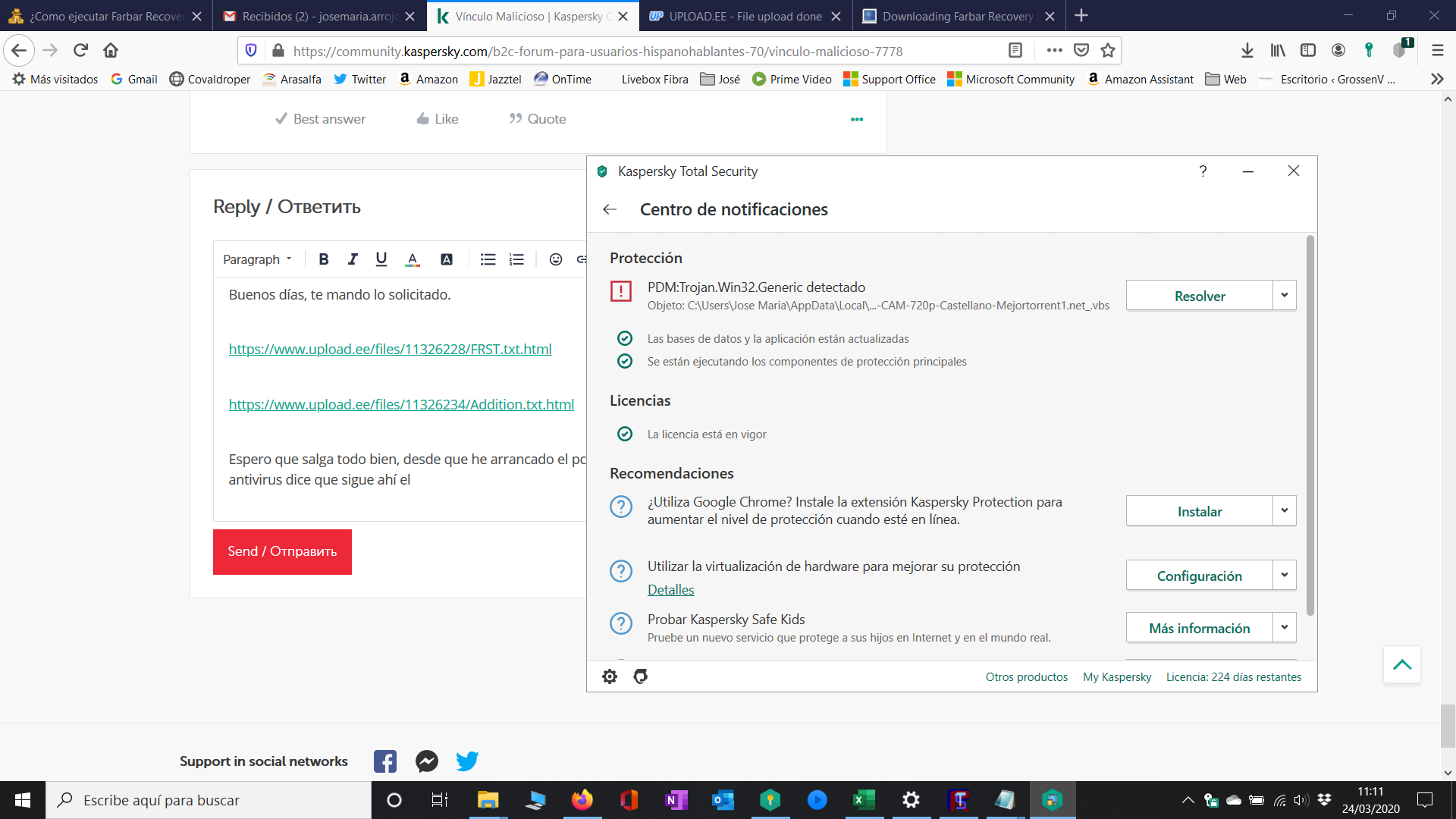 Ok, al final los archivos temporales de la carpeta \Temp te dejó borrarlos, incluido el script.vbs que detectaba Kaspersky?