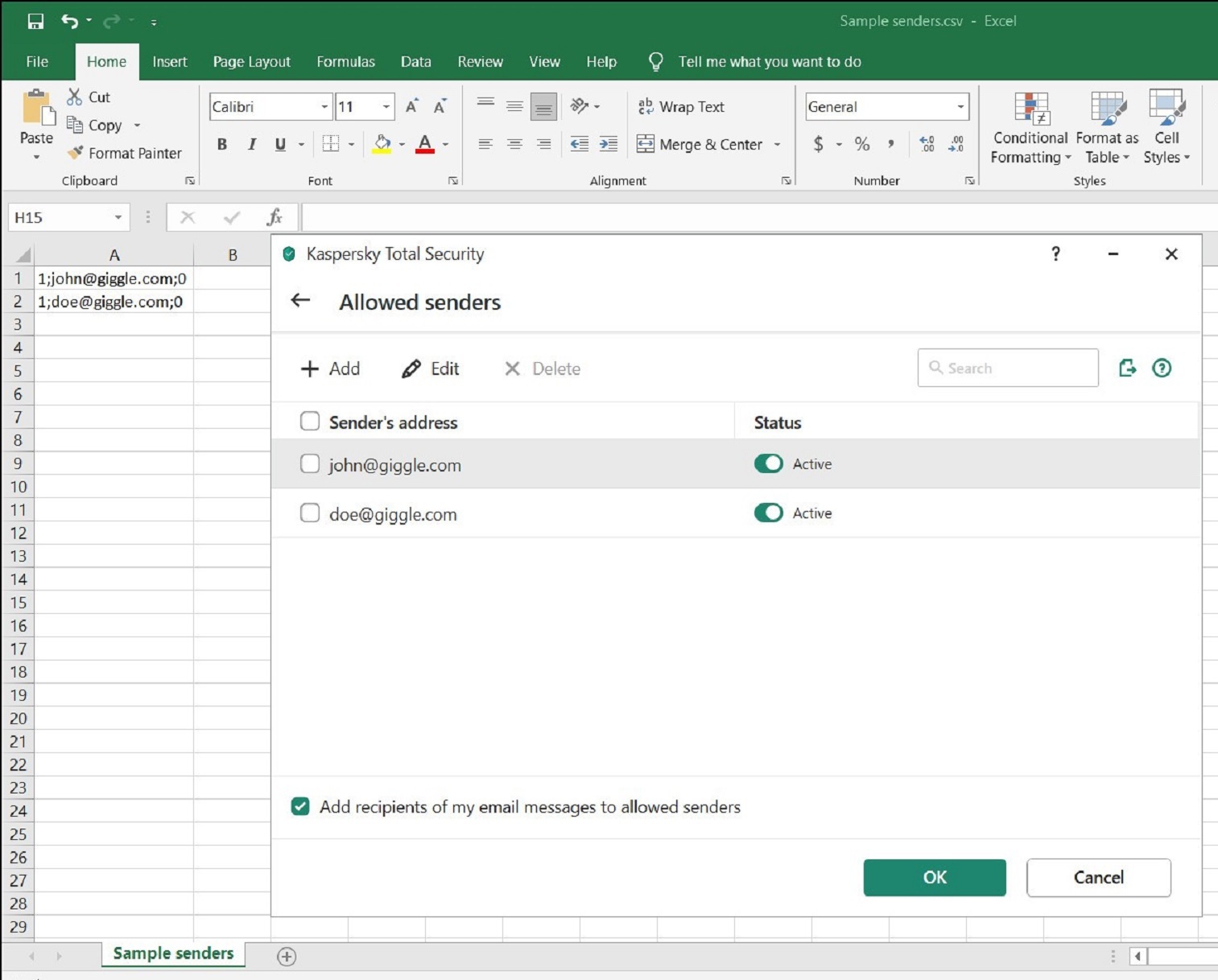 I exported my collected emailadresses from thunderbird to a *.CSV-file and then tried to import those emailadresses into the Antispam-function of KIS2021. The import did not work only stating there was an error but not stating WHAT the error was.